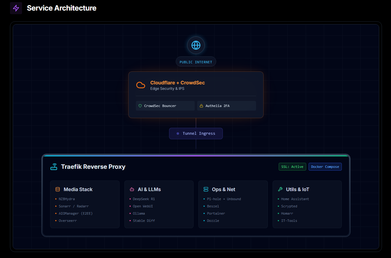 Architected a hybrid SSO stack (Authelia + CrowdSec + Traefik). Performed RCA on system crashes (Load Avg 180 / 9GB memory leak), developing a Python TUI for real-time container health and remote SSH orchestration.